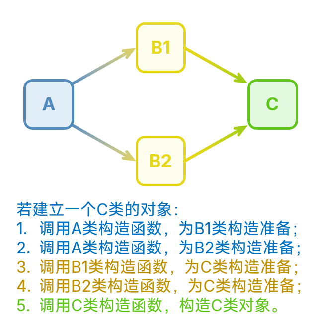 最终继承类必须负责调用各层继承类的构造函数以分别完成对各个对象的实例化。